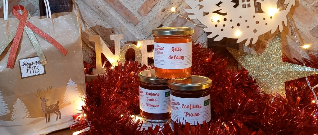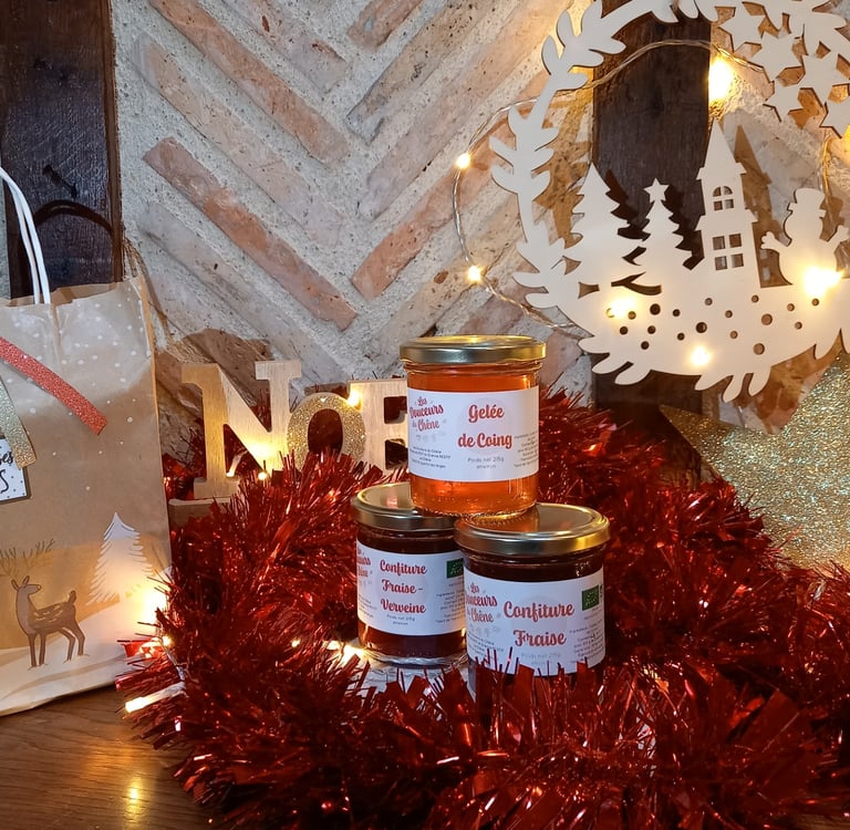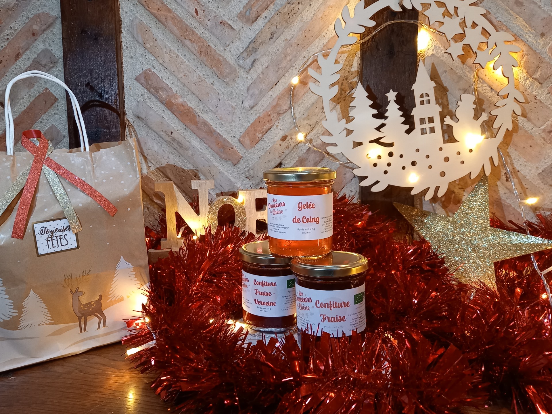 Coffret de noël confitures trio 215g (15€) : Fraises / Fraises-Verveine / au choix (Myrtilles, Pêches, Prunes, Gelée Fruits Rouges, Gelée de coings)