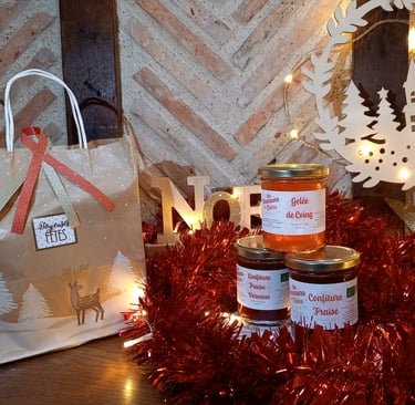 Nous vous proposons pour les fêtes de fin d'année plusieurs idées cadeaux avec nos produits de la ferme. Vous y retrouverez nos confitures issues des fruits bio du verger ainsi que nos produits mohair confectionnés à partir de nos chèvres angora.